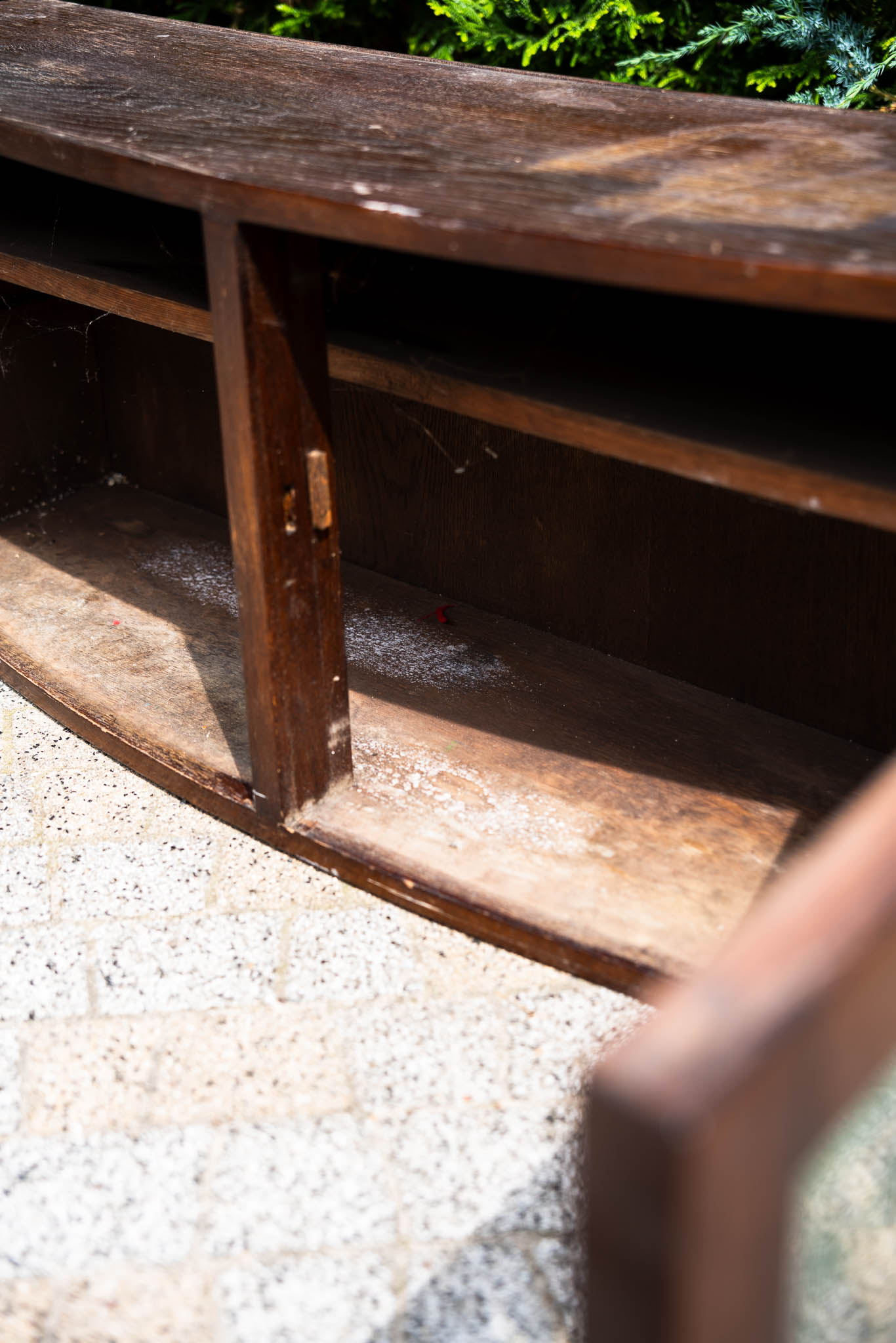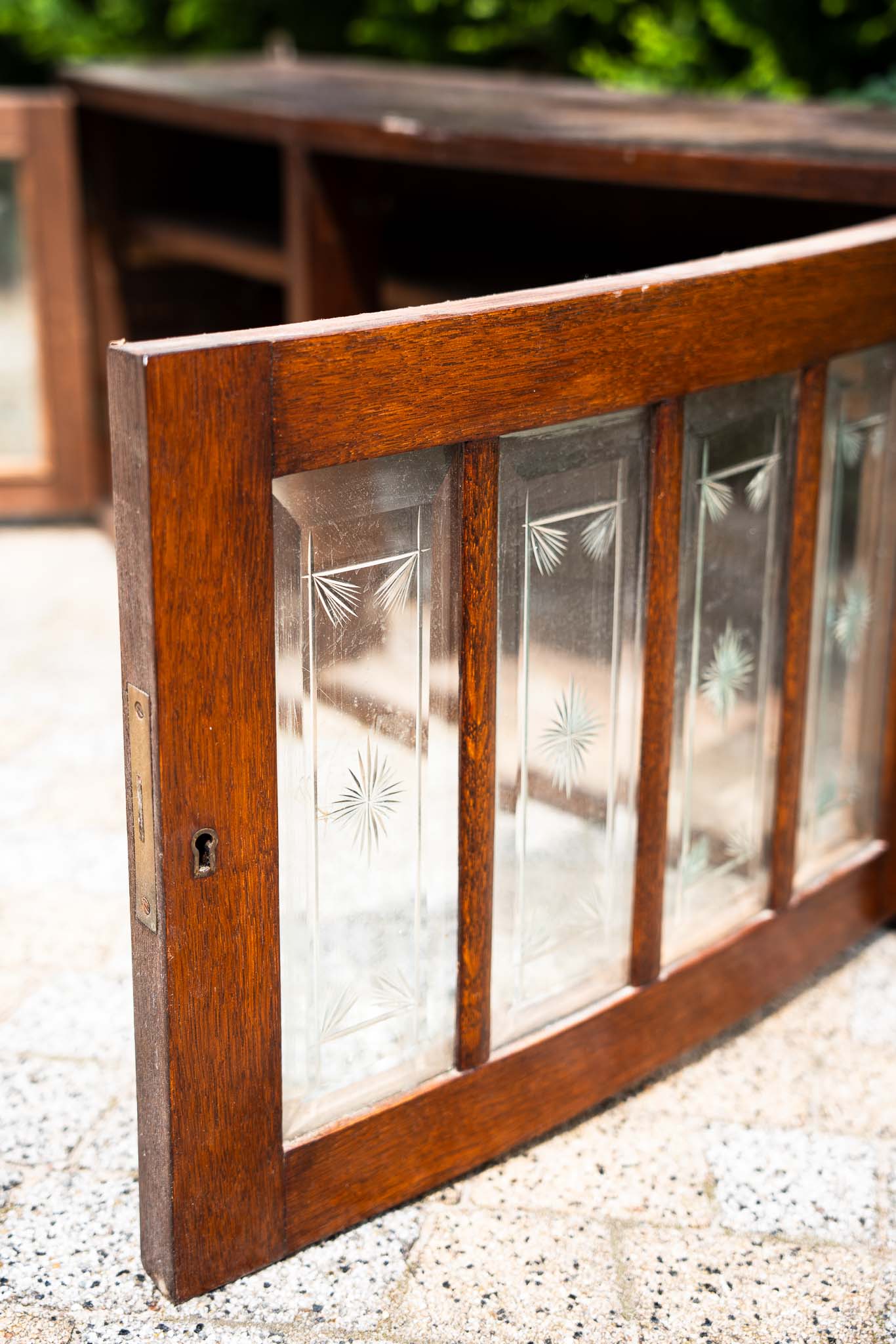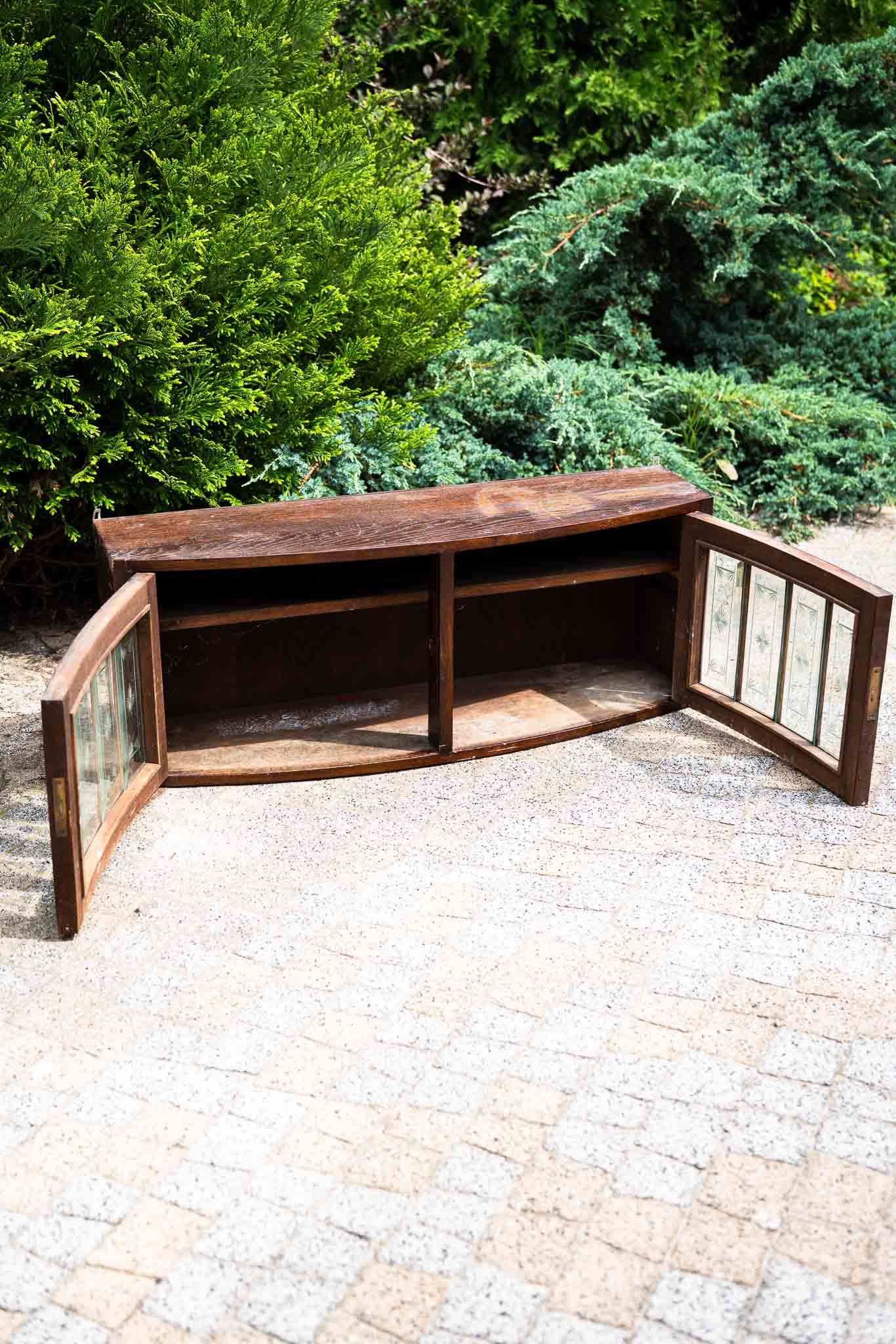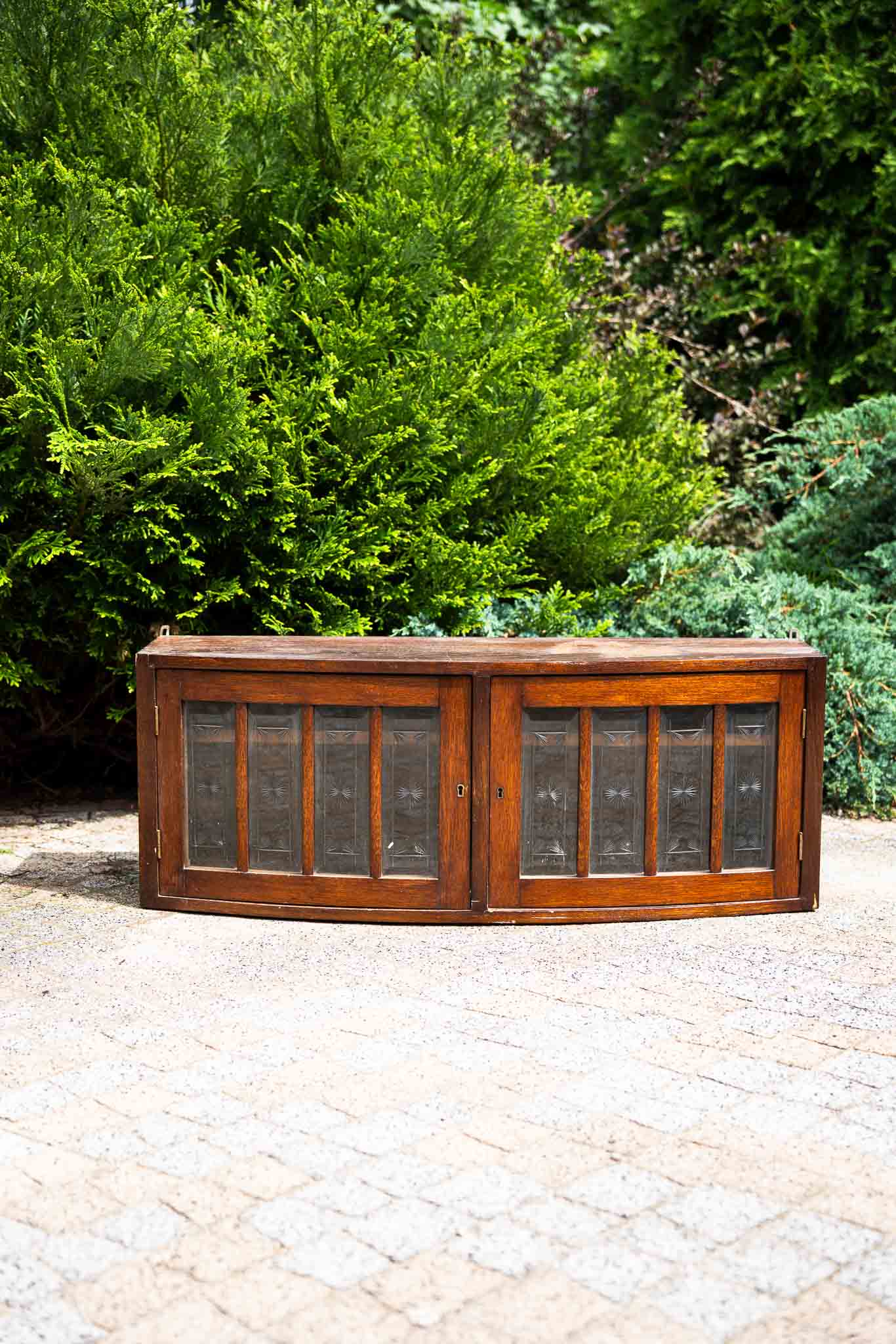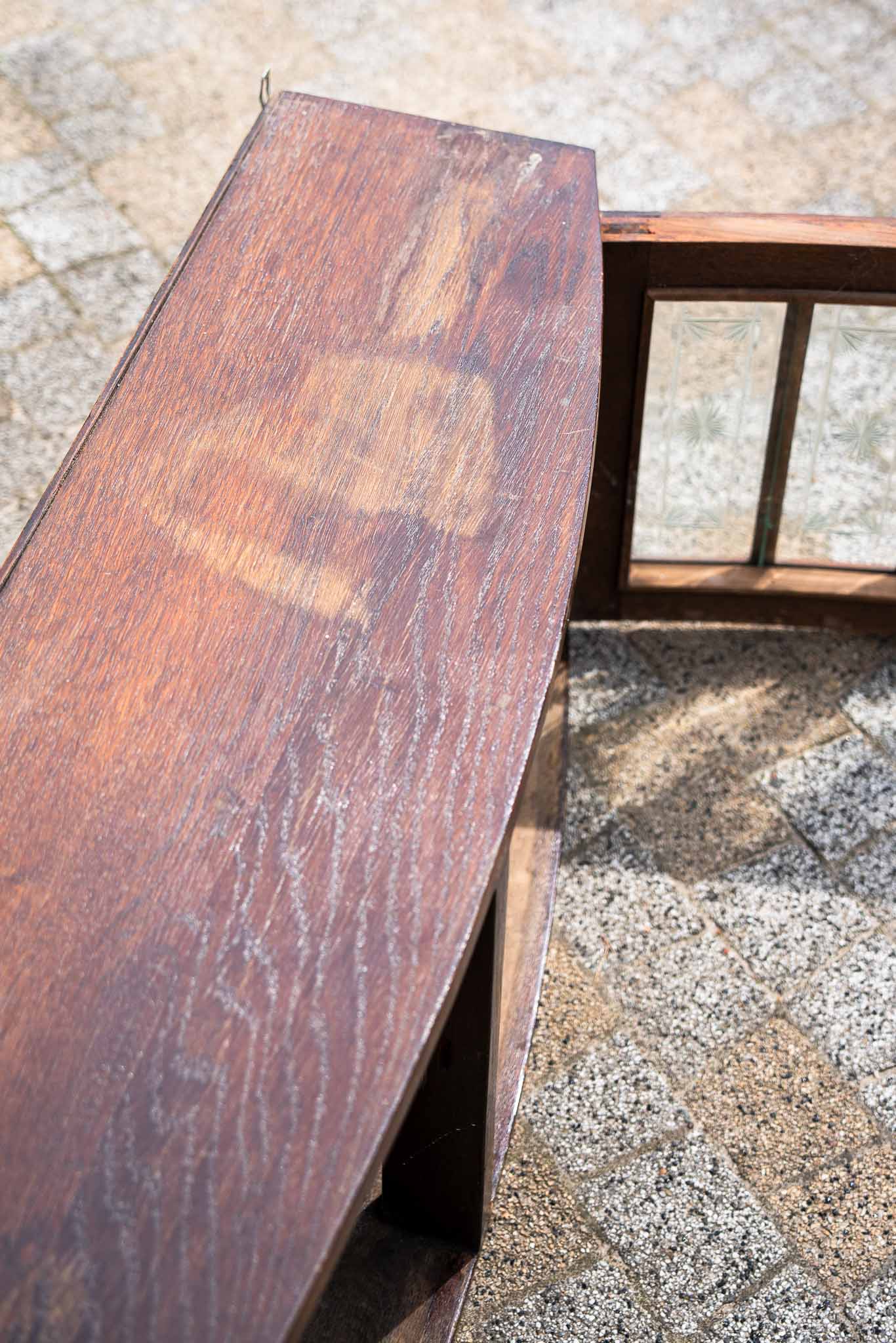 Zgrabna, wisząca nadstawka od kredensu, najprawdopodobniej przedwojenna, z zachowanym oryginalnym przeszkleniem szybkami kryształowymi i rzadkim kształtem drzwiczek. Do salonu, do dużej łazienki, nad blat w kuchni. Po renowacji można będzie uzyskać jaśniejsze wybarwienie drewna albo zupełnie zmienić kolor.