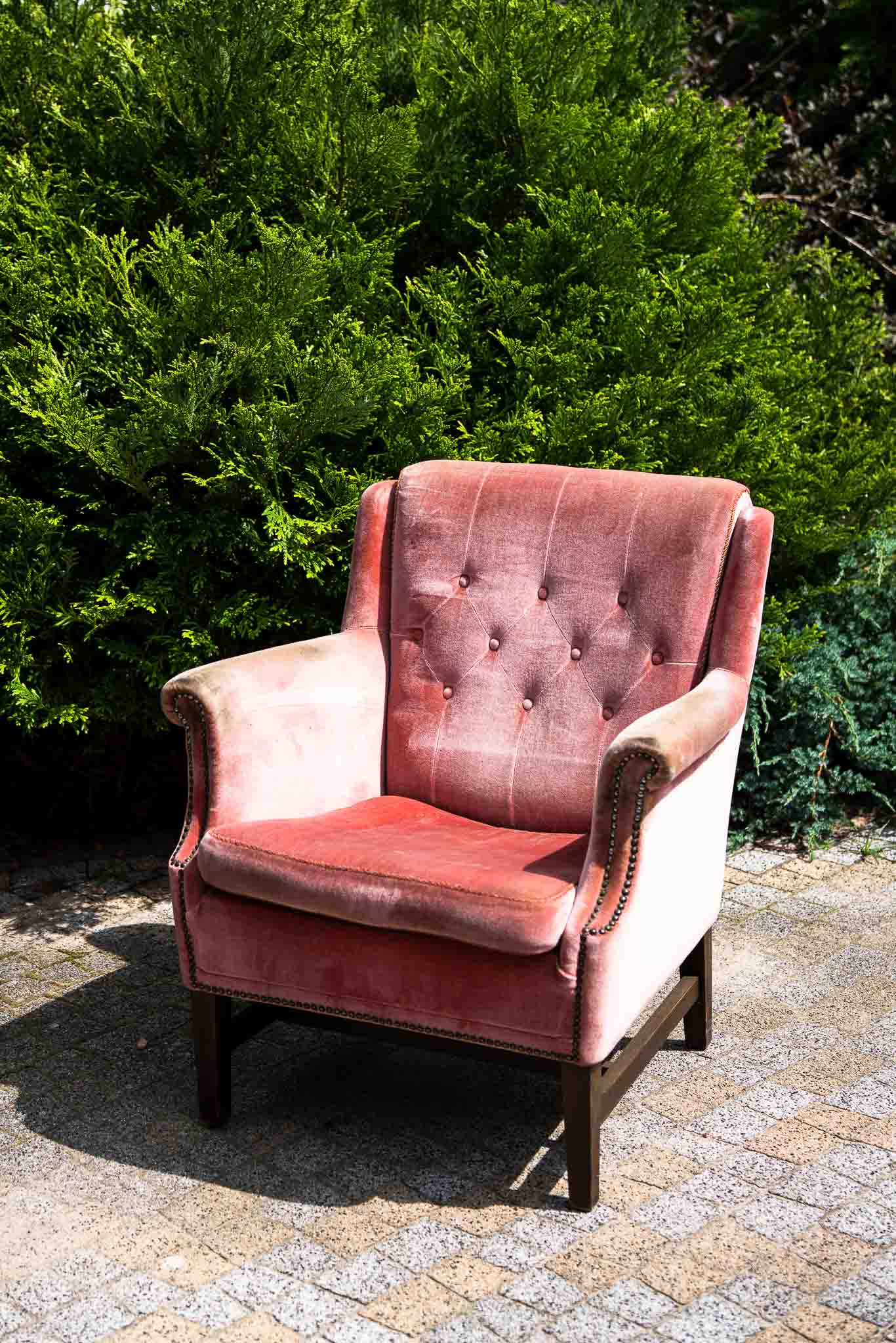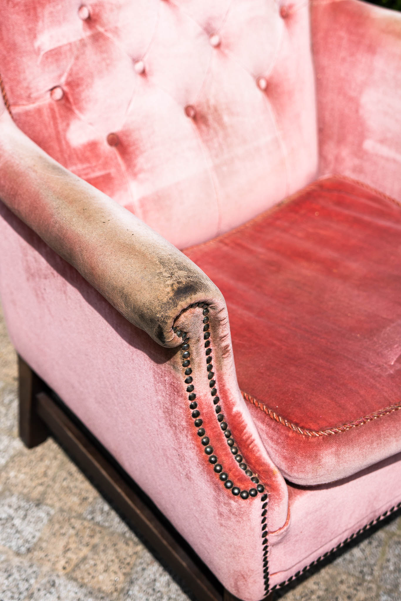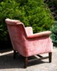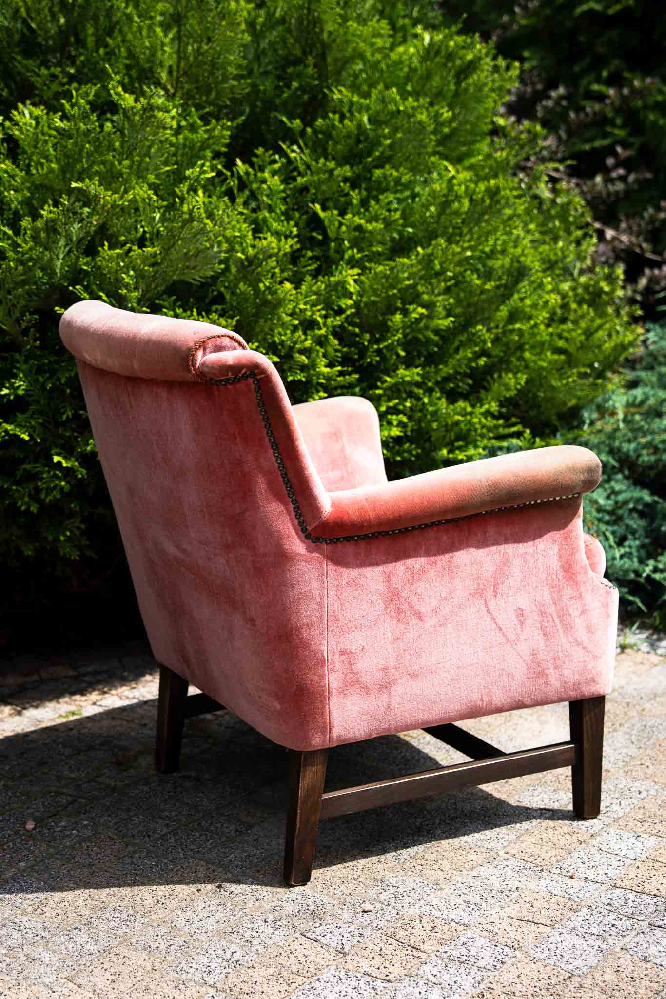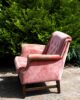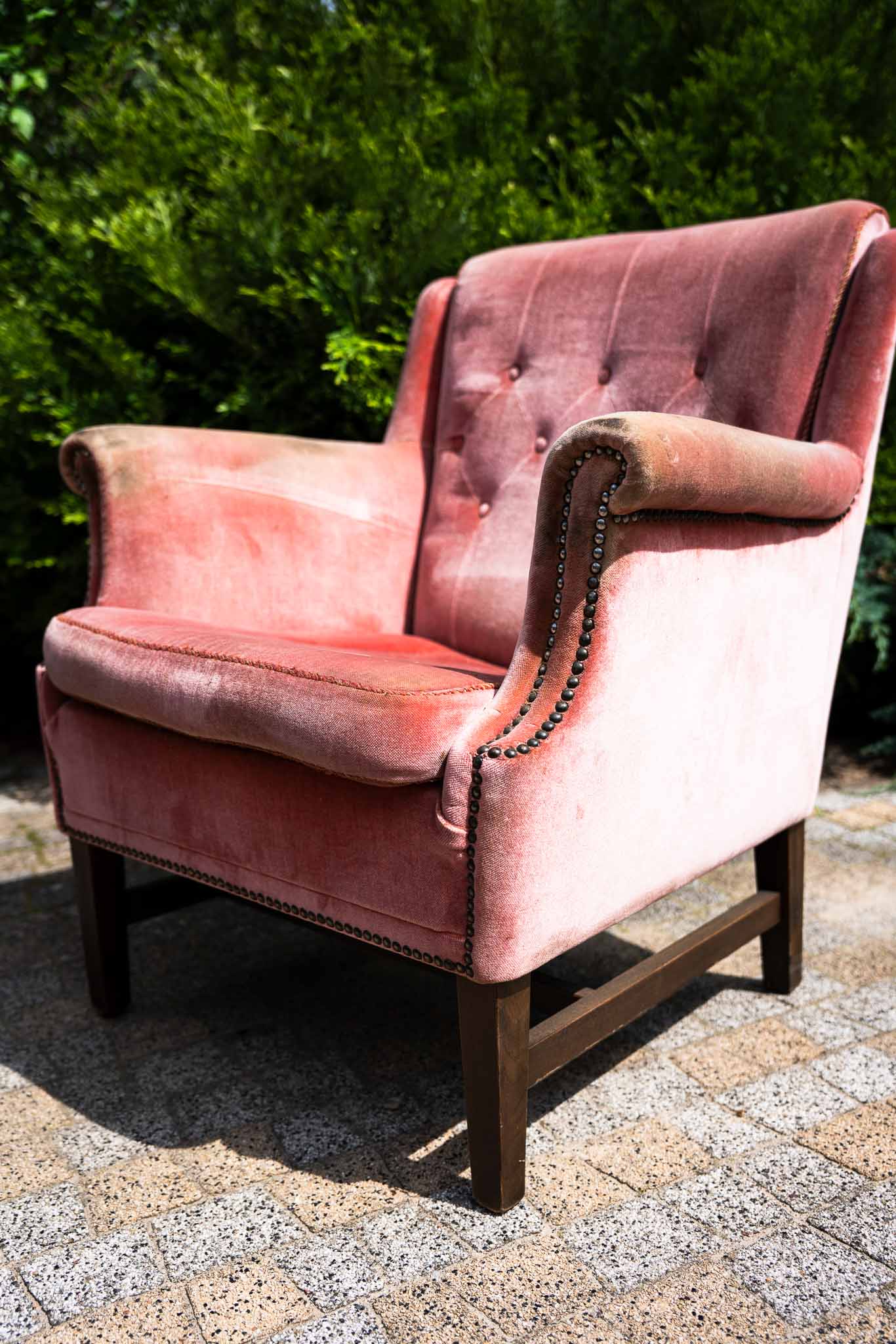 Fotel klubowy na drewnianych nóżkach. Pochodzi z Danii, najprawdopodobniej to lata 80-te. Oryginalnie ciemnoróżowy, do kupienia w stanie widocznym na zdjęciach albo po renowacji w naszej pracowni.