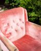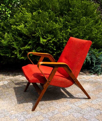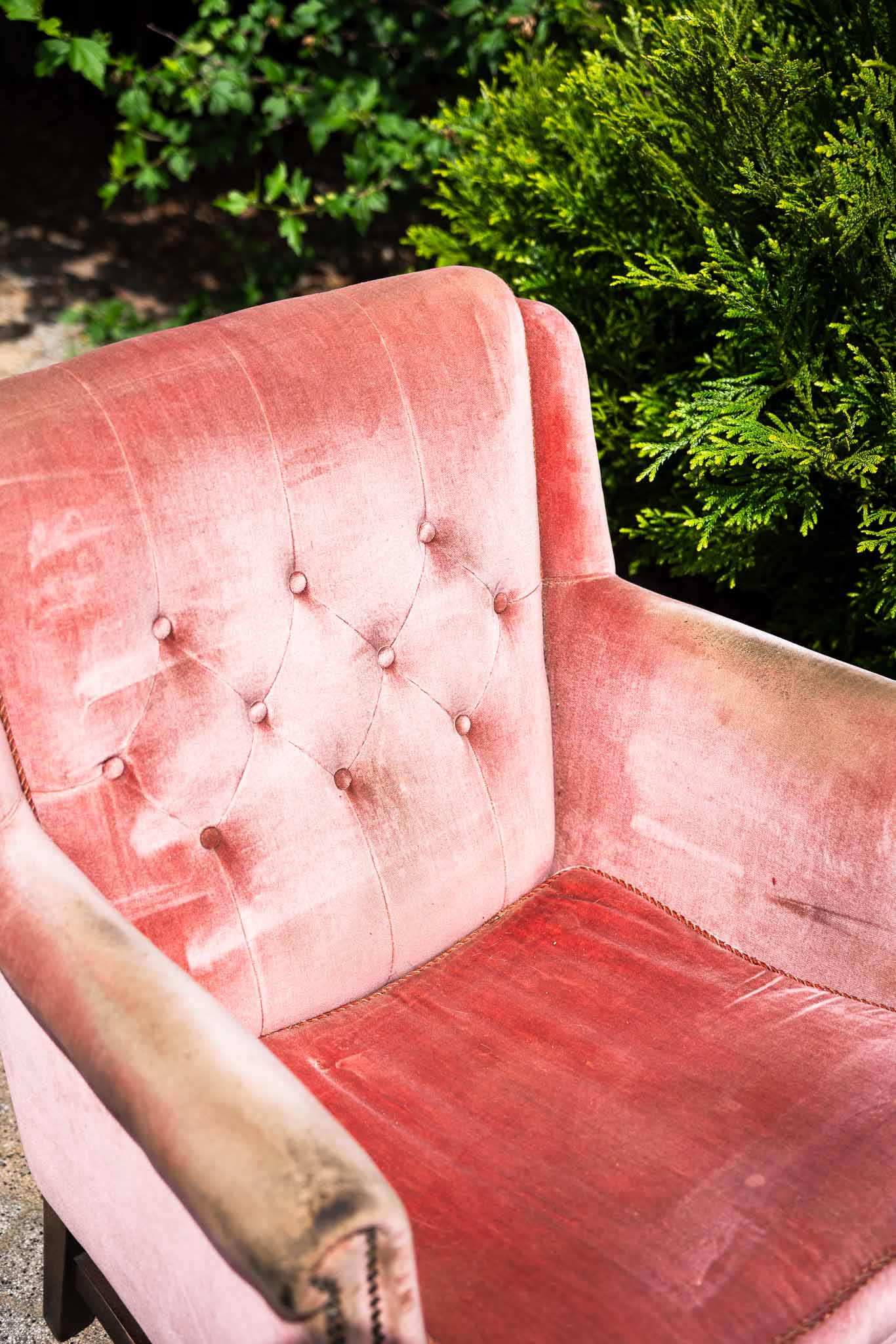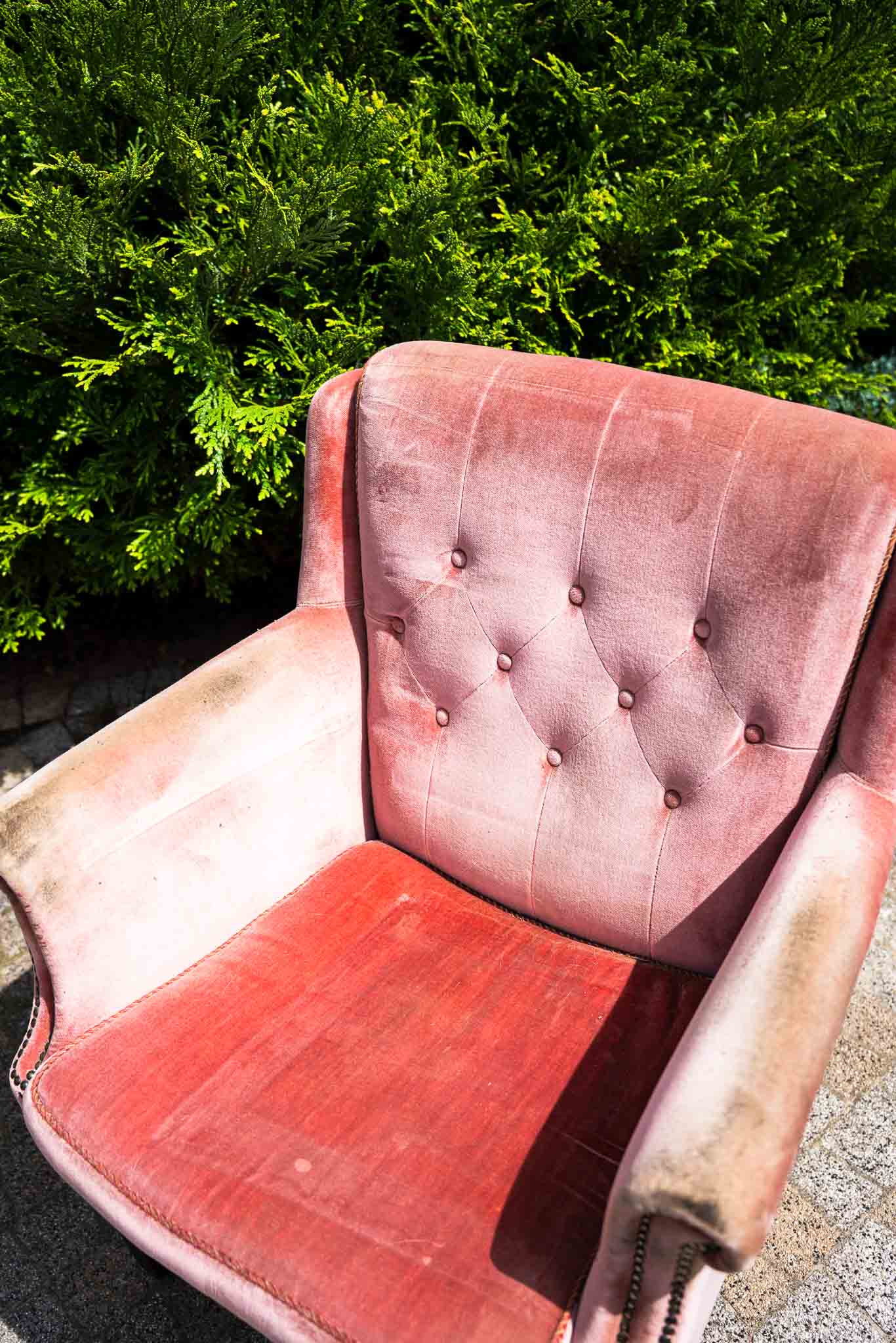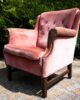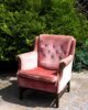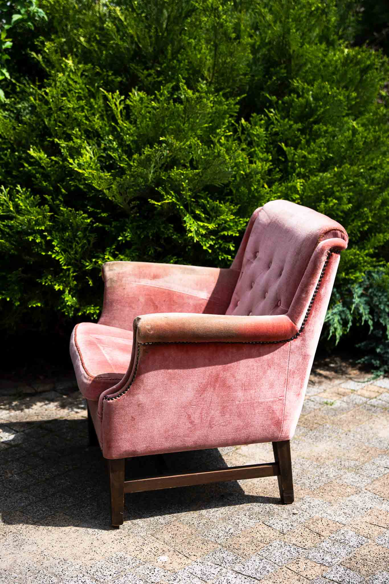 Fotel klubowy na drewnianych nóżkach. Pochodzi z Danii, najprawdopodobniej to lata 80-te. Oryginalnie ciemnoróżowy, do kupienia w stanie widocznym na zdjęciach albo po renowacji w naszej pracowni.