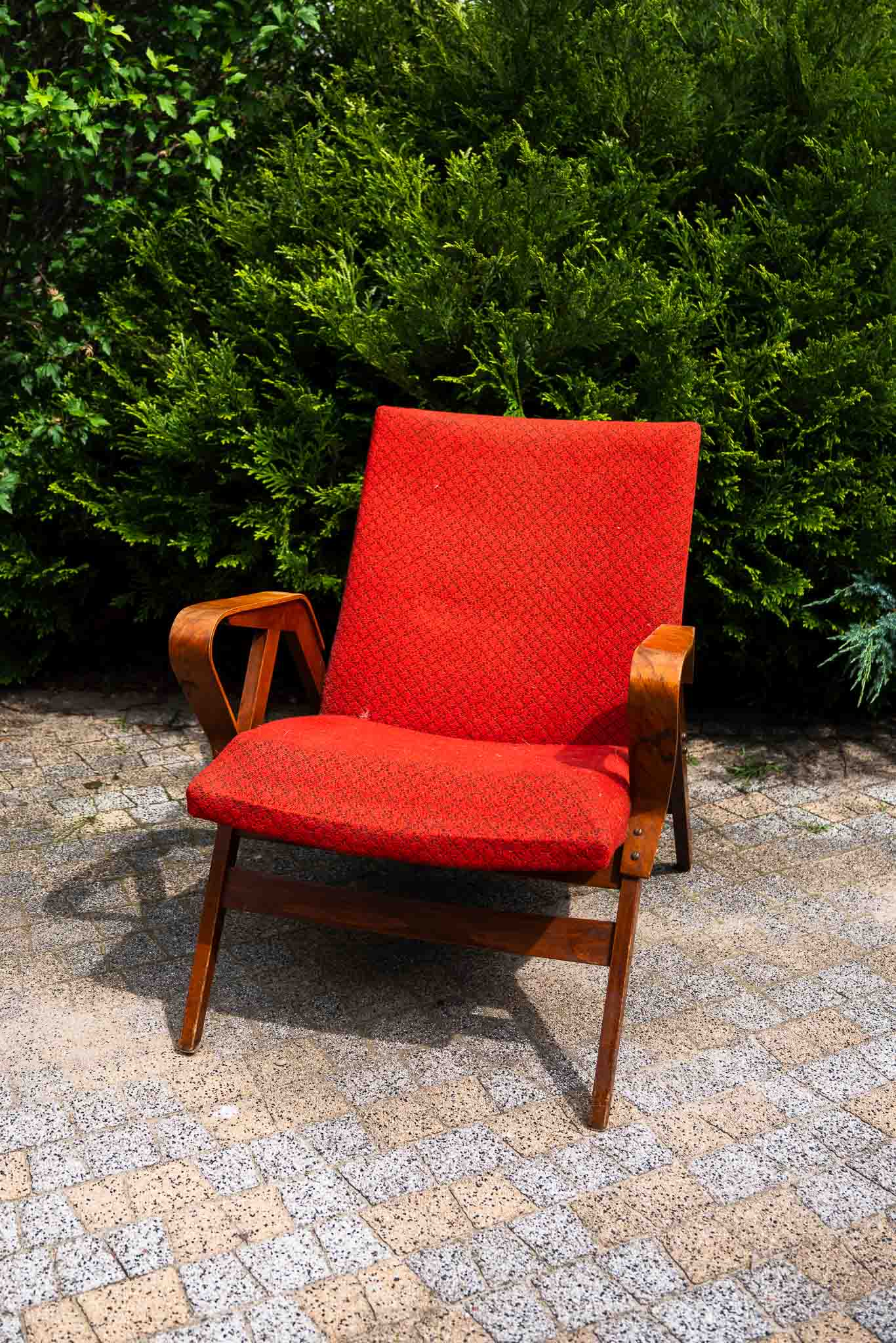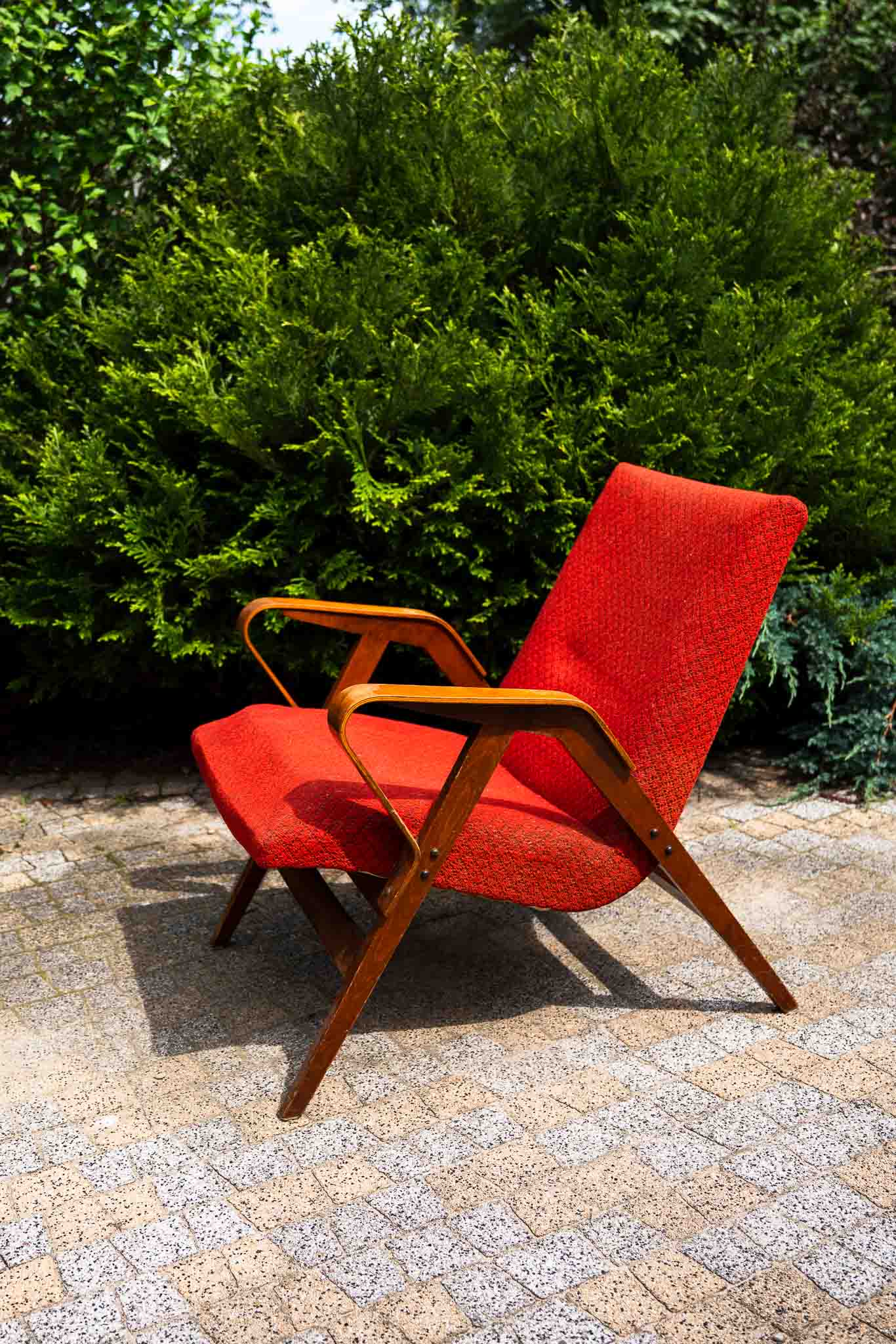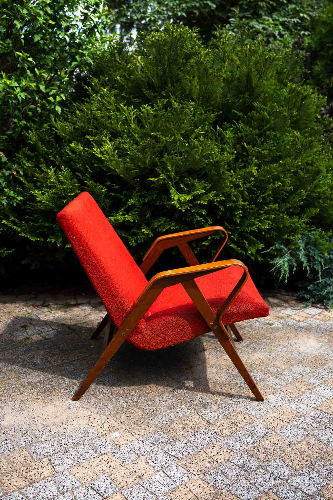 Fotel z giętymi podłokietnikami ze sklejki. Model 24-23, proj. František Jirák dla Tatra Nabytok, Czechosłowacja, lata 60-70.