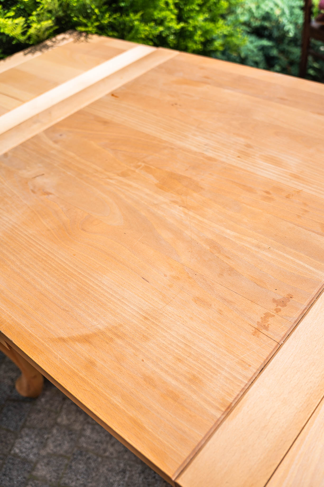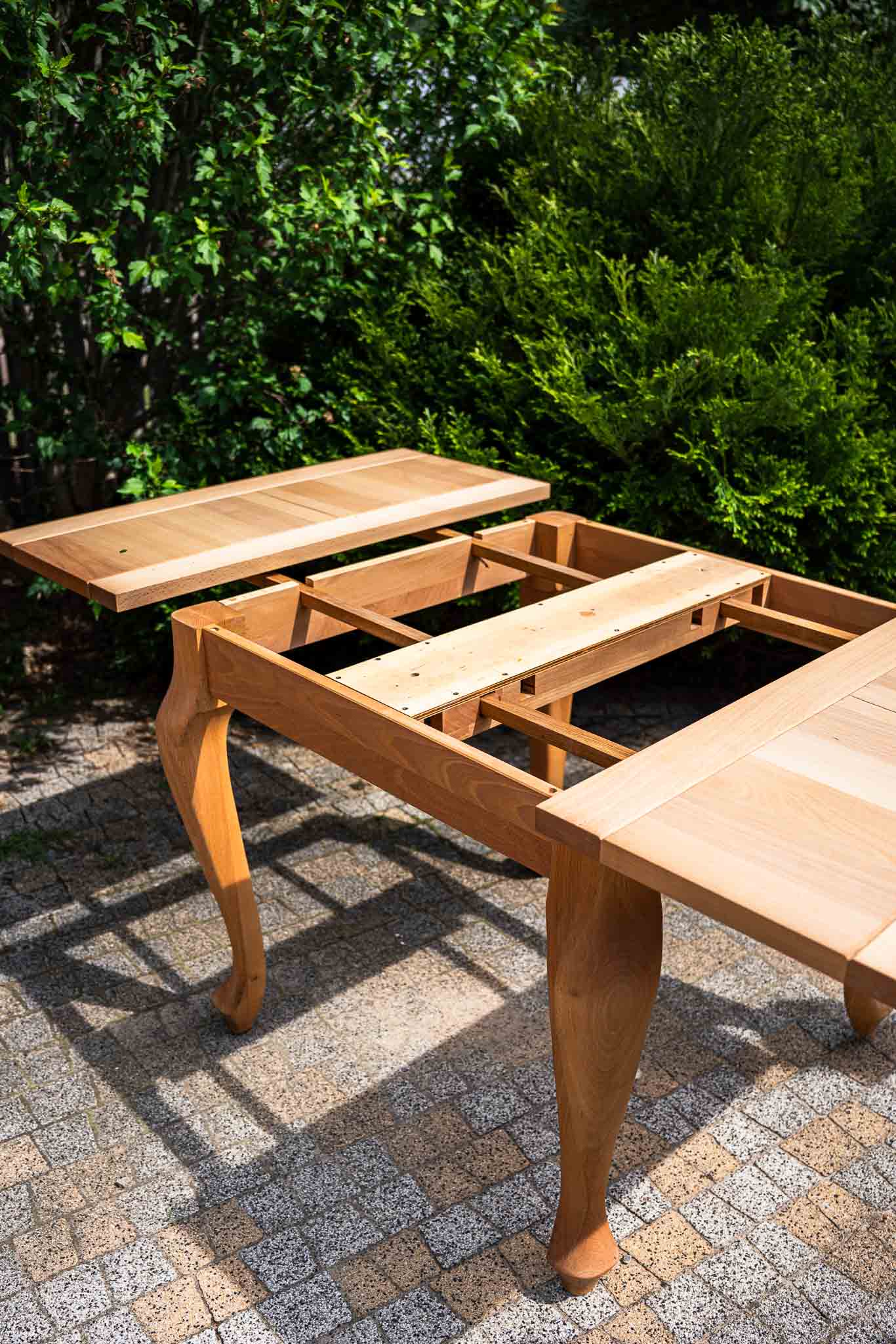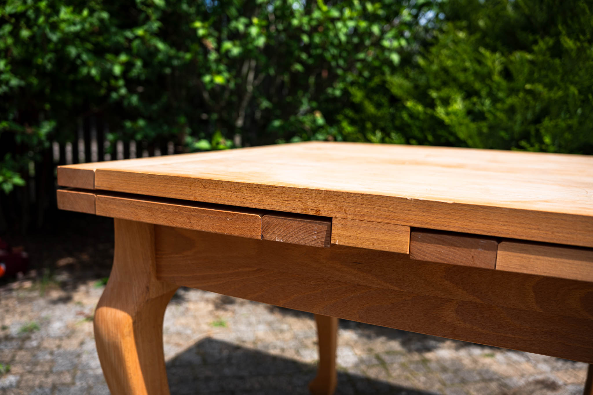 Stół bukowy, rozkładany, wyprodukowany około 2010. Lekkie wypaczenia blatu (widać na zdjeciach).