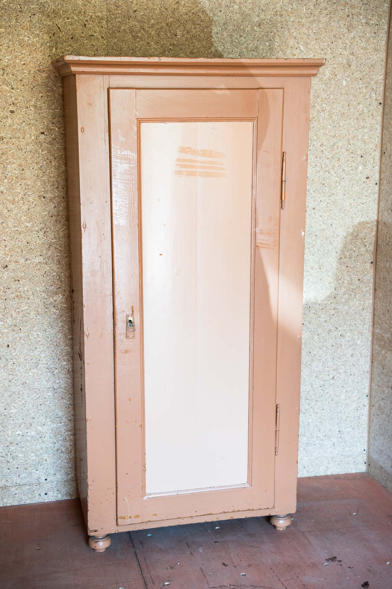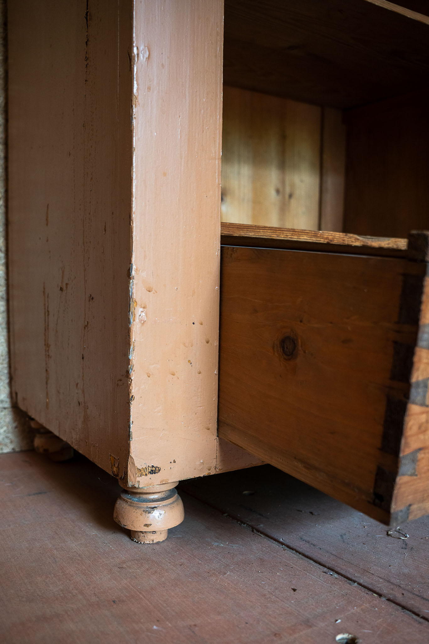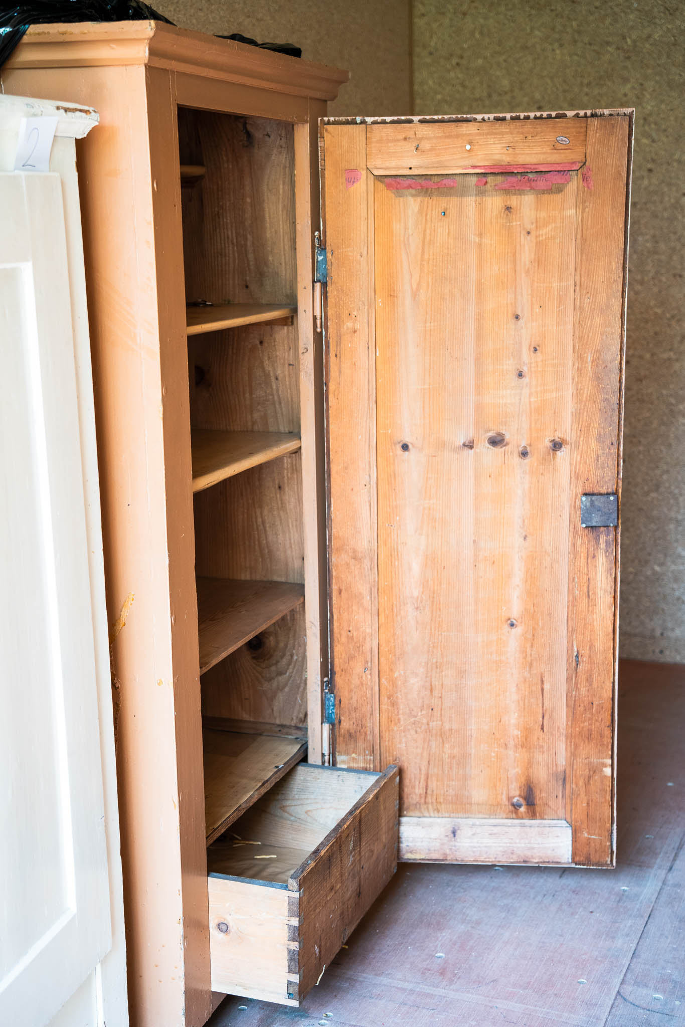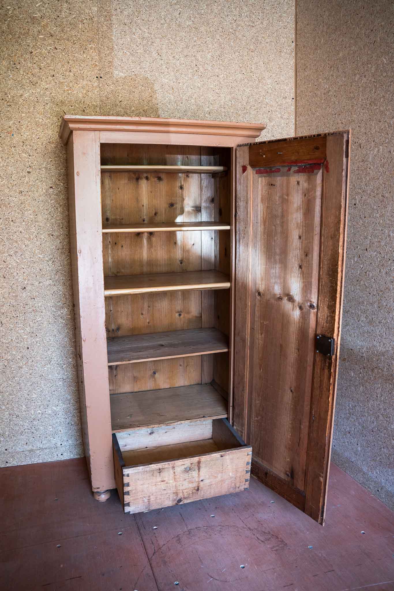 Przedwojenna szafa chlebowa, sosnowa. Po renowacji powinna otrzymać sitko w drzwiach, charakterystyczne dla mebli tego typu. Mebel jest aktualnie w stanie do renowacji. Wnętrze jest surowe, ma szufladę i 4 półki.