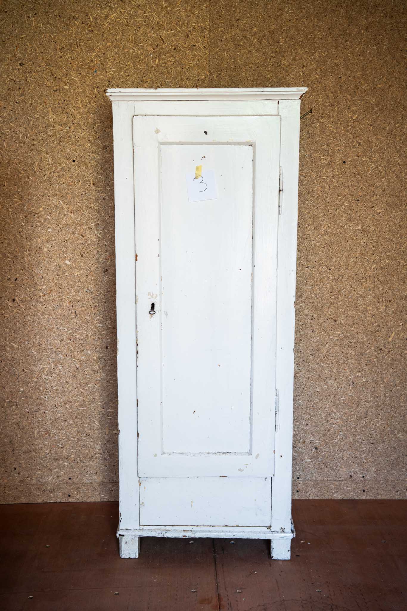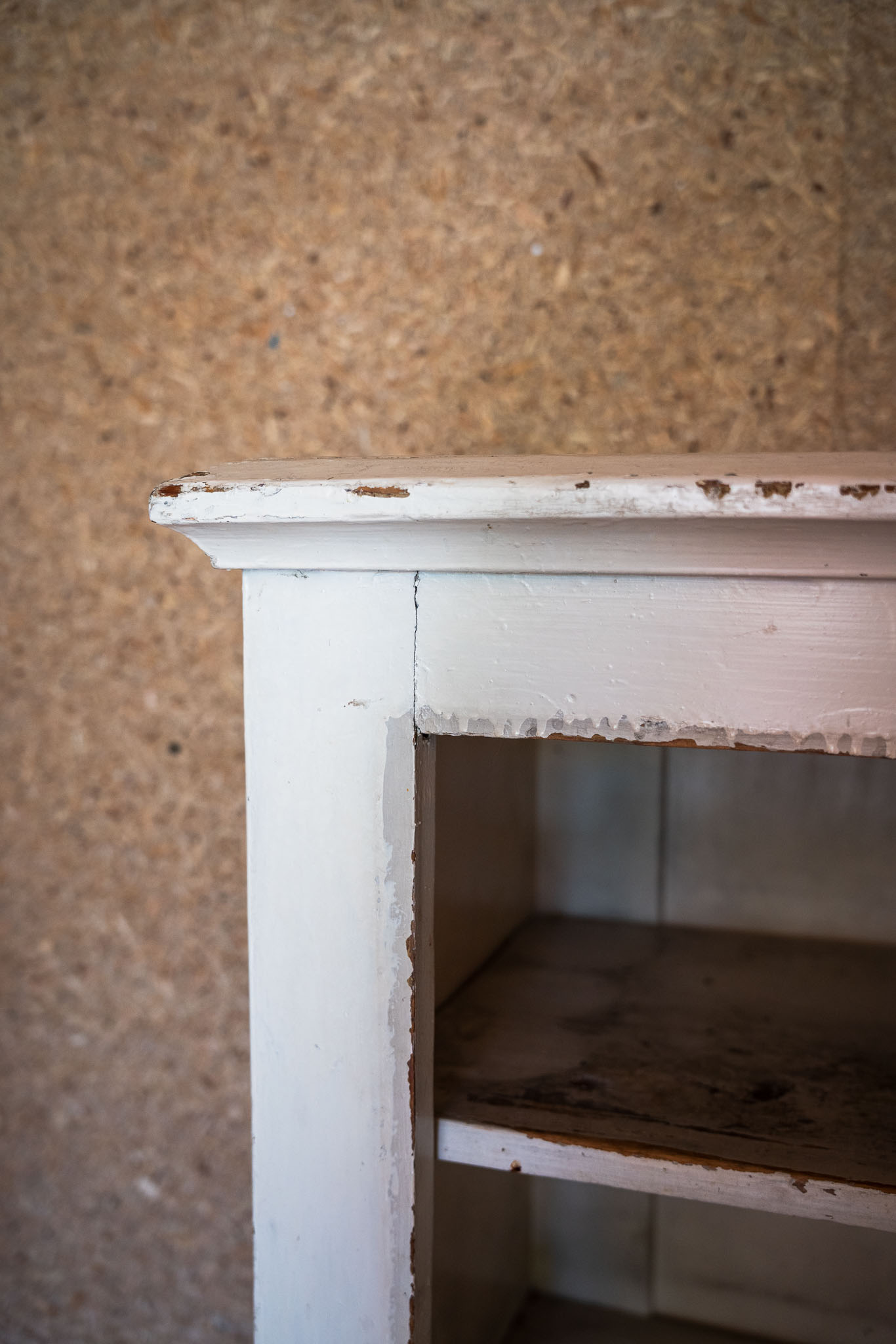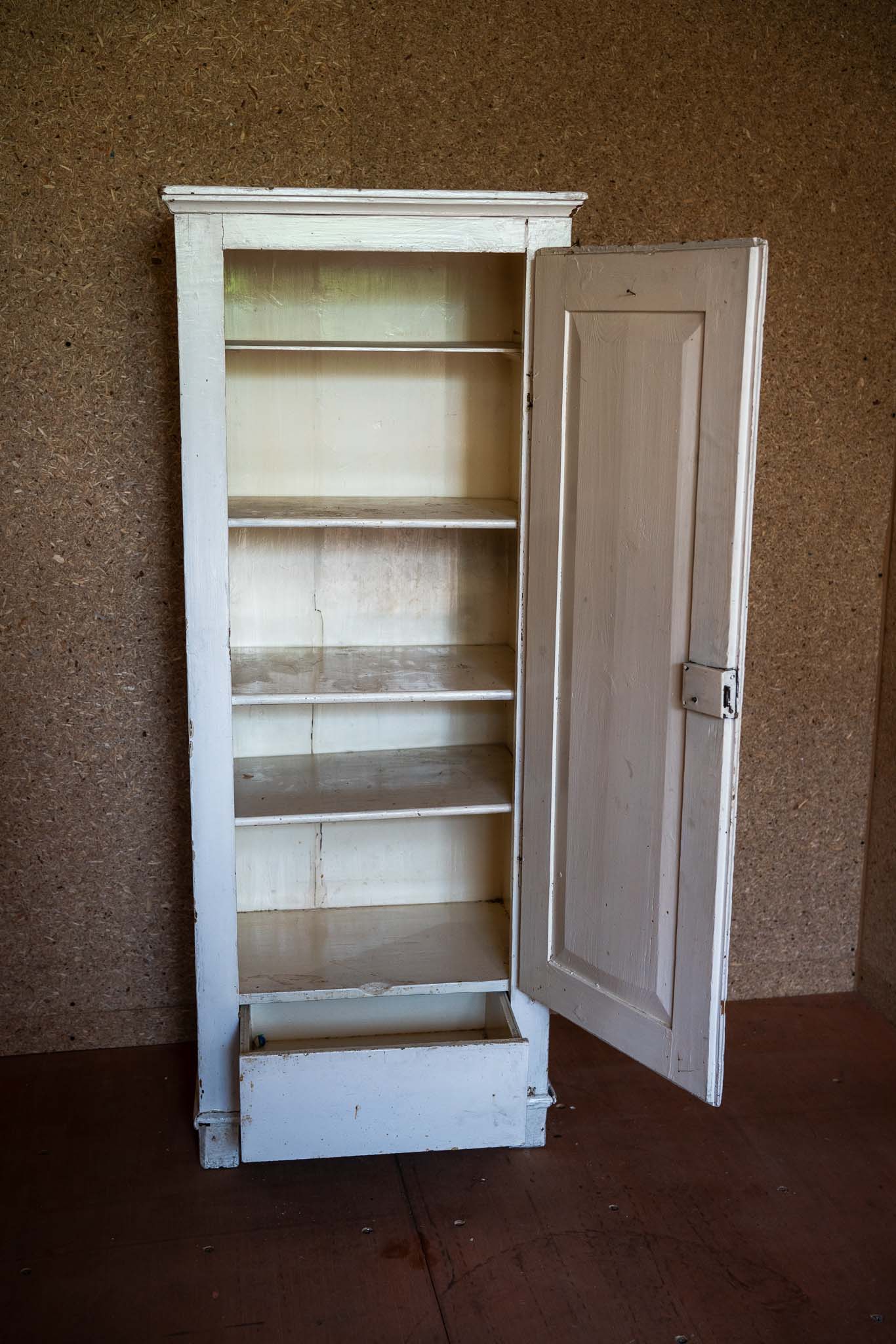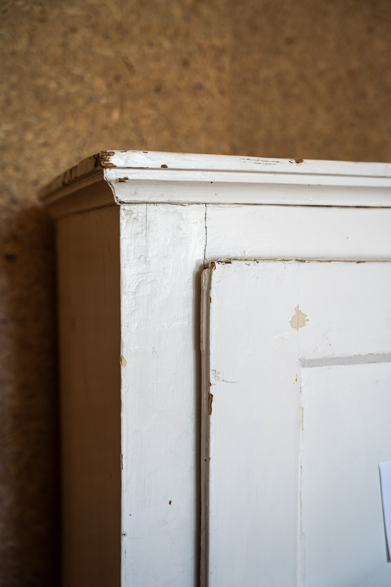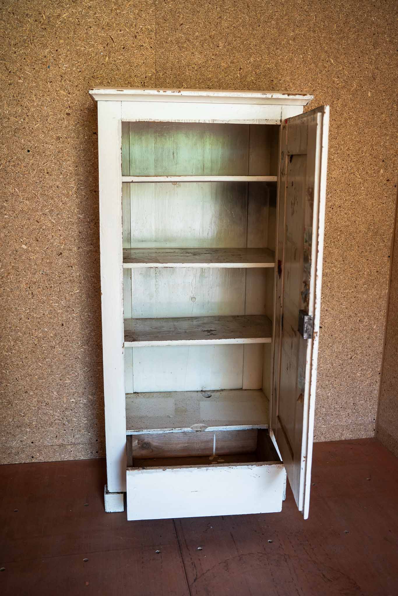 Przedwojenna szafa chlebowa, sosnowa, przyjechała ze Śląska. Po renowacji powinna otrzymać sitko w drzwiach, charakterystyczne dla mebli tego typu. Mebel jest aktualnie w stanie do renowacji. Wnętrze jest surowe, ma szufladę i 4 półki. Zachowanw oryginalne okucia.
